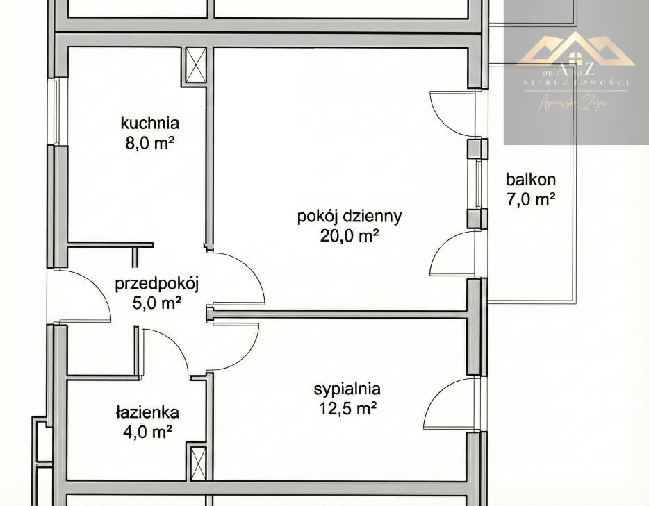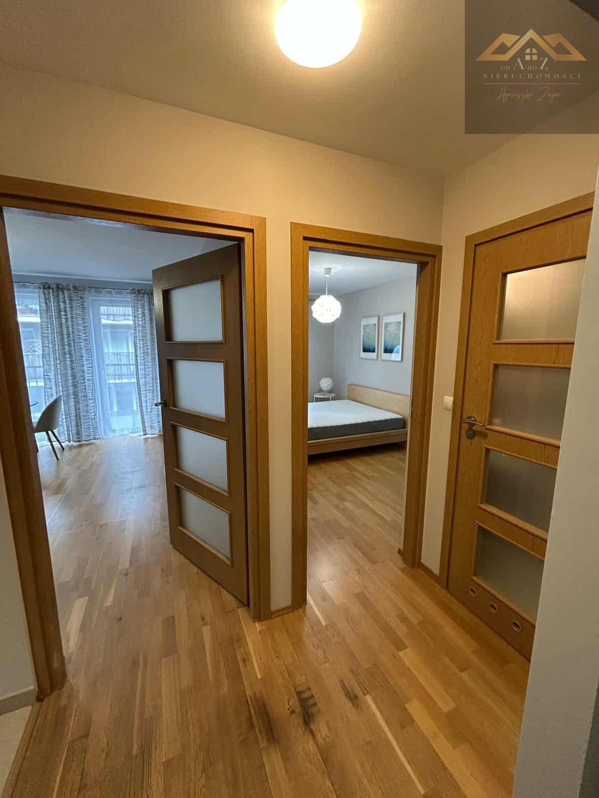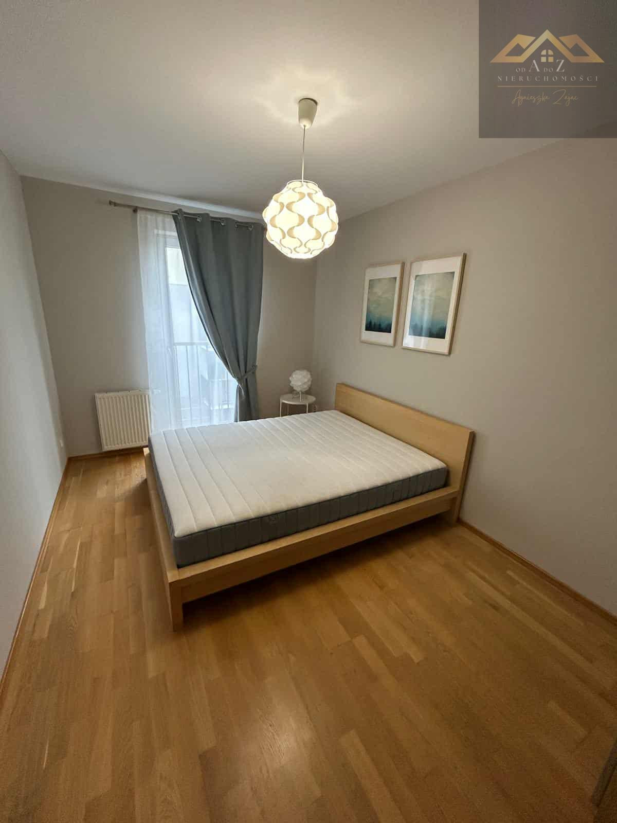 Układ pomieszczeń: przestronny salon z dużym balkonem, przytulna sypialnia z łóżkiem i pojemną szafą, oddzielna, w pełni wyposażona kuchnia (lodówka, piekarnik, płyta grzewcza, zmywarka), łazienka z prysznicem, pralką i zabudową na przechowywanie, przedpokój z pojemną szafą wnękową.